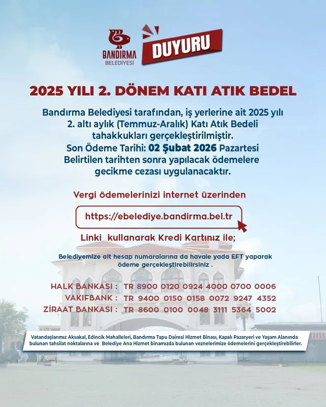 Bandırma Belediyesi, iş yerlerine yönelik 2025 yılının Temmuz–Aralık dönemini kapsayan ikinci altı aylık katı atık bedeli tahakkuk işlemlerini tamamladı.