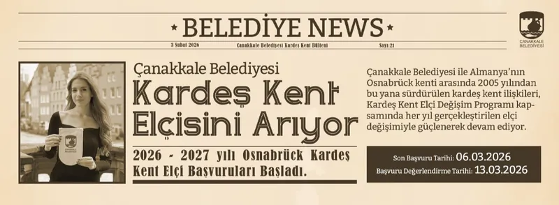 Program kapsamında, 1 Ekim 2026 – 30 Eylül 2027 tarihleri arasında Çanakkale’yi Osnabrück’te temsil edecek Kardeş Kent Elçisi için başvuru süreci başladı. Bir yıl boyunca Osnabrück’te ikamet edecek elçi, iki şehir arasındaki projelere aktif katkı sunacak.